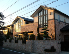 外観はレンガとシックイ作りの一見邸宅。内装に内部はレッドシダーをふんだんに使った別荘風に。